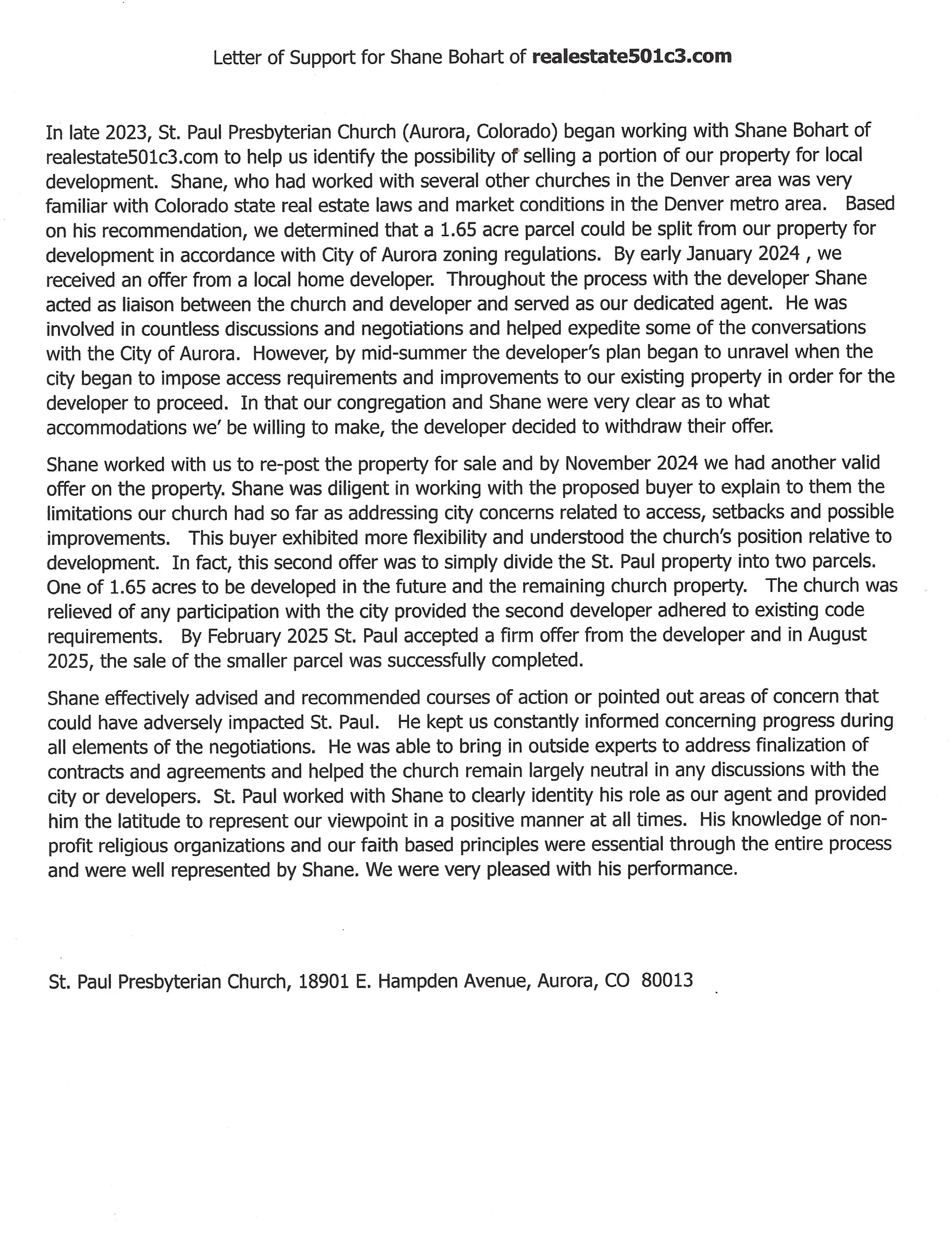 A testimonial regarding fiduciary services to Church at Hidden Lake (Faith Based Organization) and achievement of 26 new apartment units on ancillary 2 acres of FBO land.